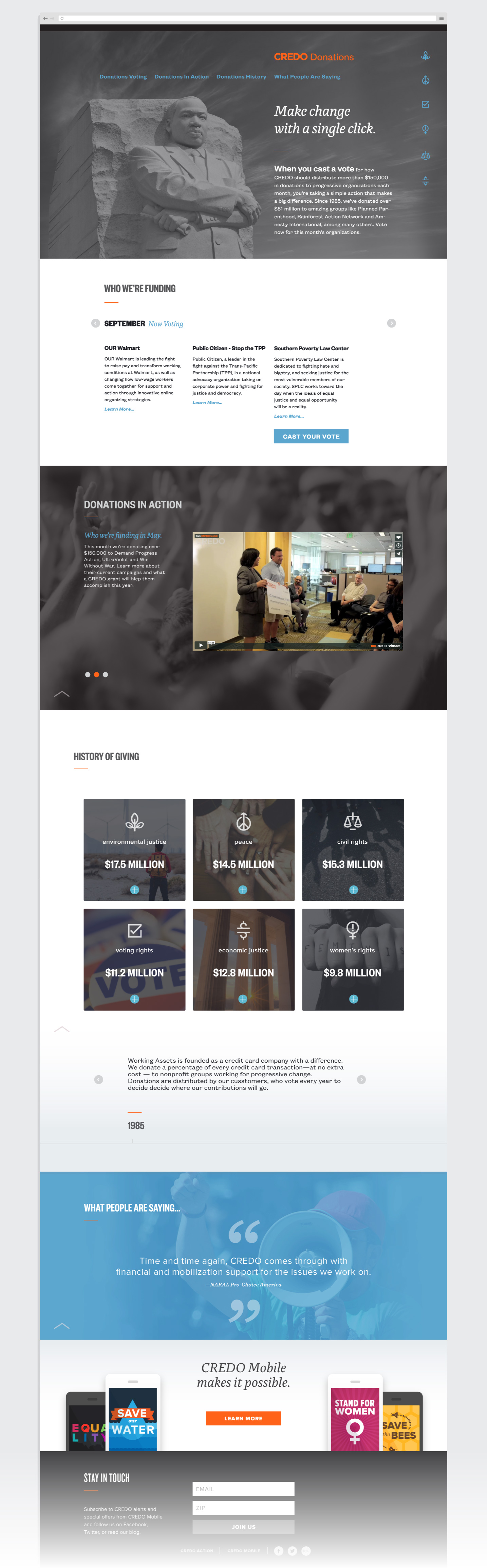 An extensive landing page featuring up-to-date donations totals, noteworthy blog posts, a list of nonprofits funded in the past year and a summary of the current month’s grantees.