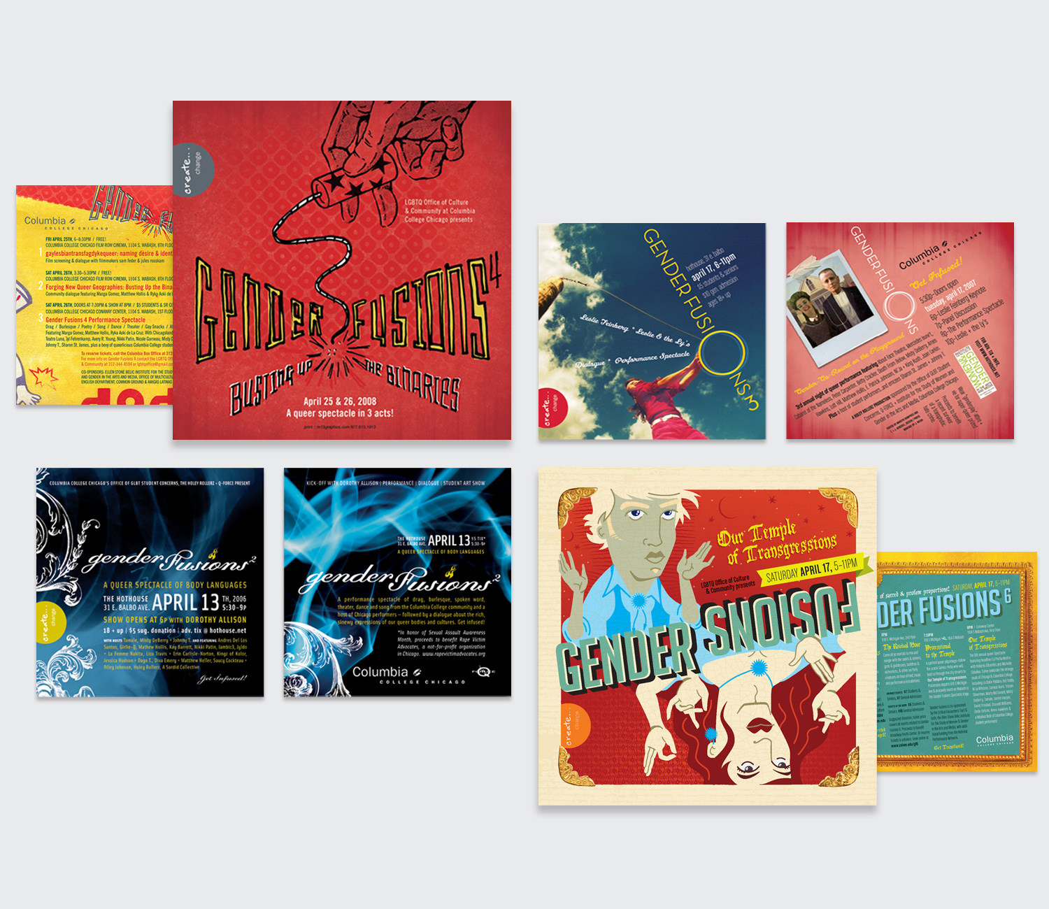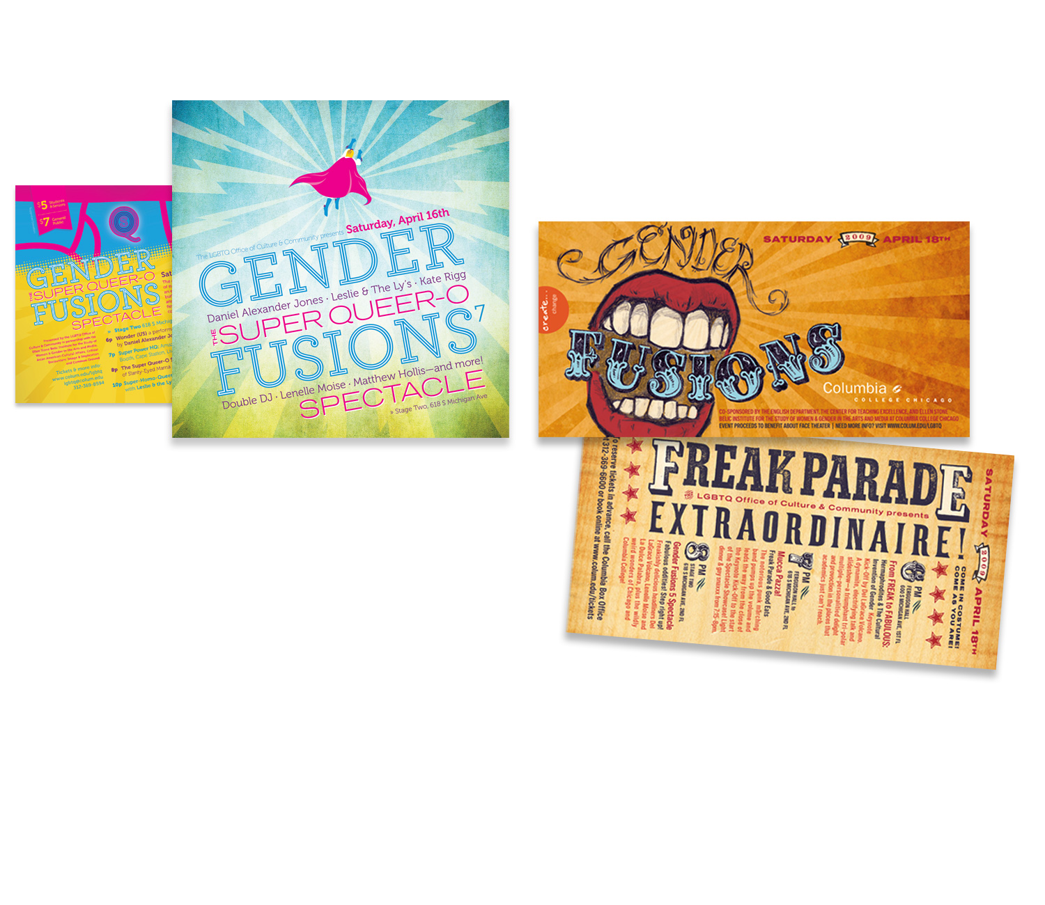 Conceived to engage and celebrate the LGBTQ community at Columbia College Chicago, this annual performance event featured a new theme each year. Highlighted are the palm cards distributed to students over the years; annual event materials also included posters, programs, buttons and other promotional items.