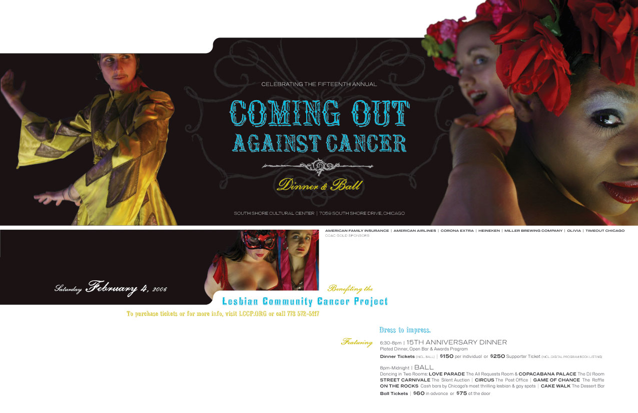 Posters produced for a range of clients. From a commemorative poster distributed to Obama GOTV volunteers in the run-up to Election Day 2008, to promotional posters for an annual fundraiser dedicated to cancer research and services for the LGBTQ community. Etcetera.