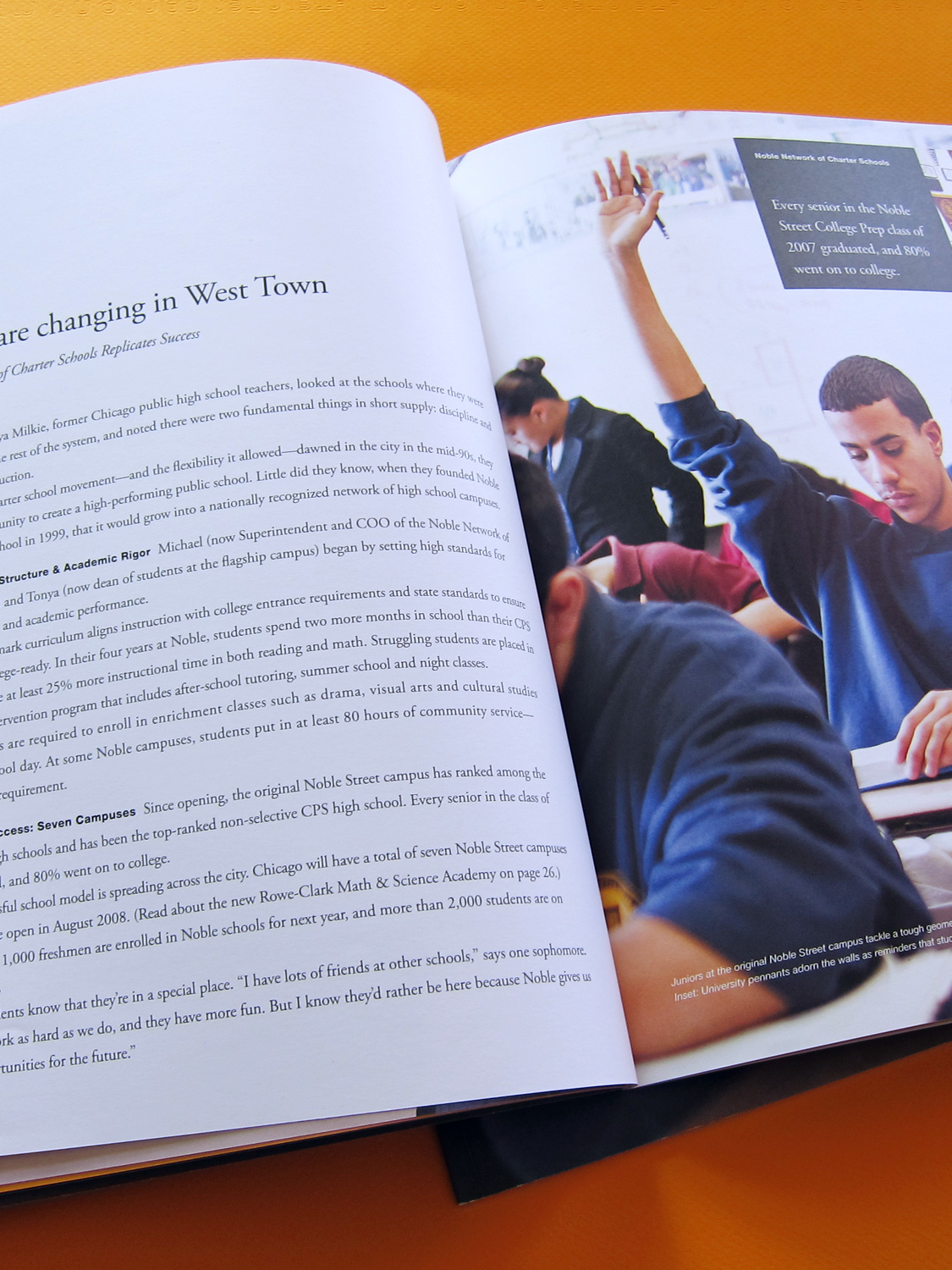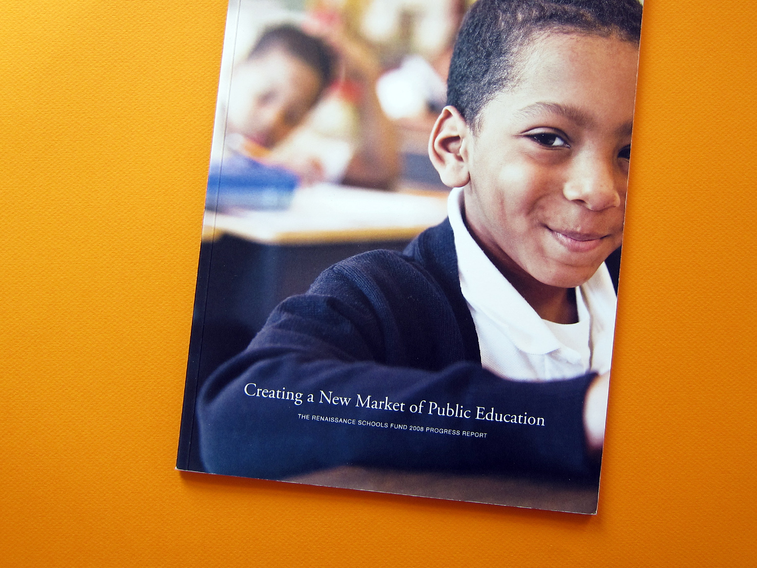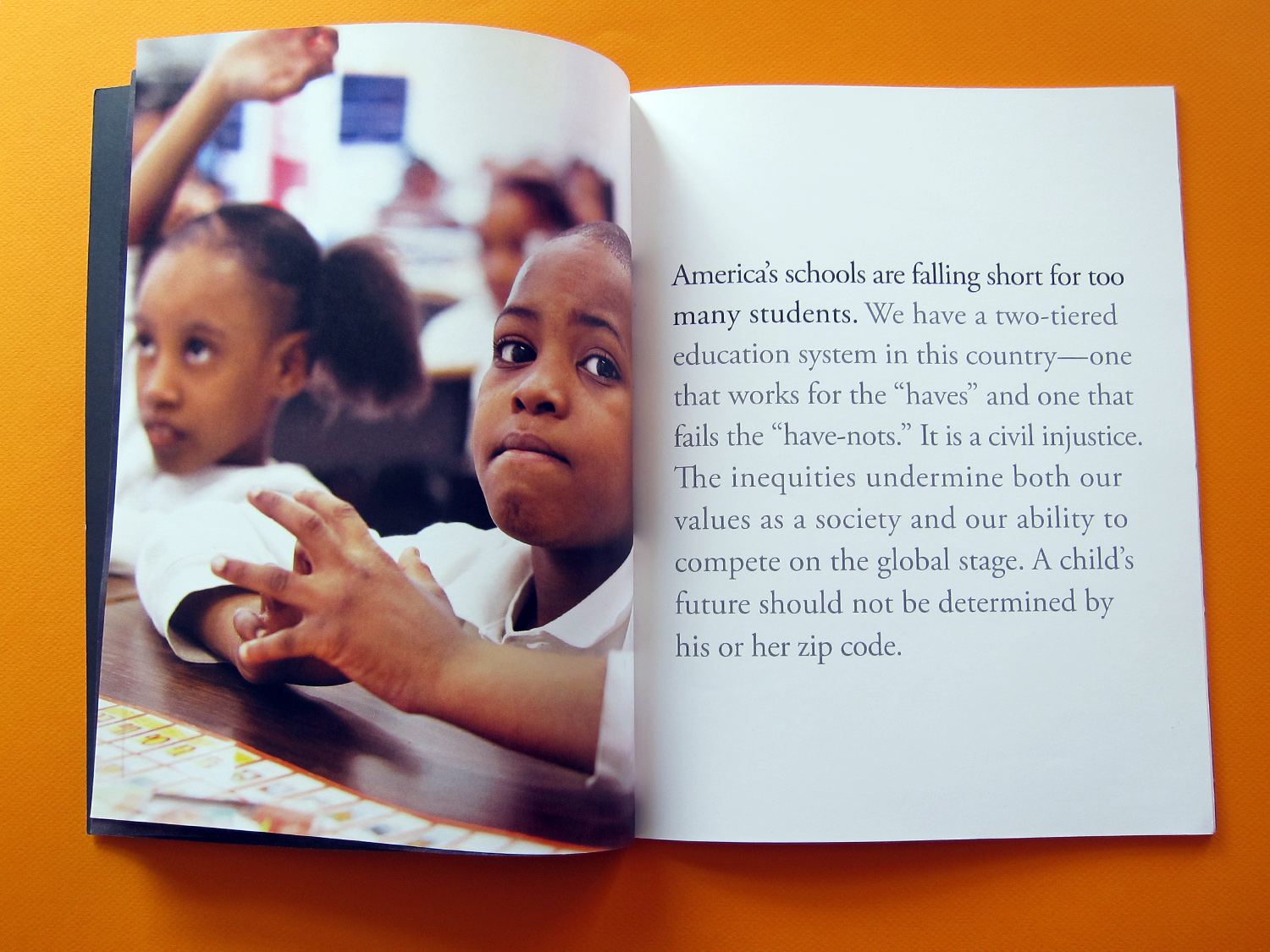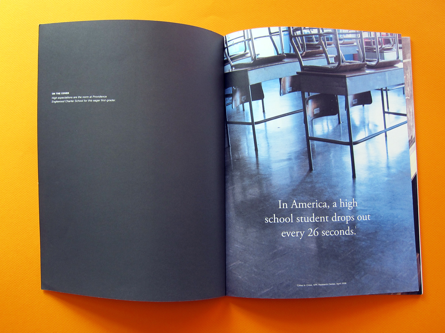 Sample spreads from the inaugural RSF annual report, an oversized, 32-page publication depicting RSF’s successes and educational worldview.